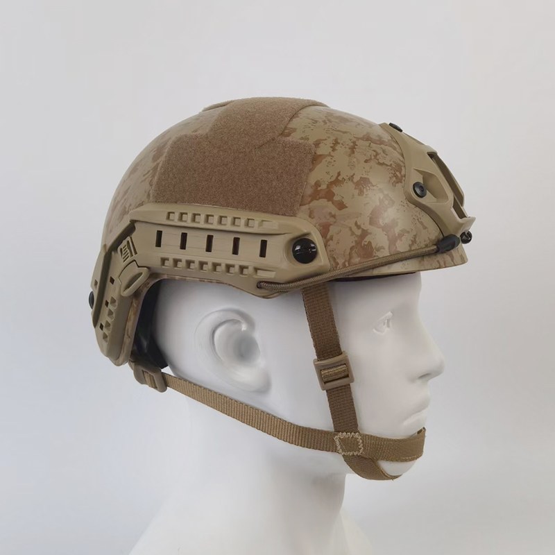 迷彩防弹头盔由盔壳和悬挂缓冲系统组成,盔壳采用超高分子量聚乙烯纤维无纬布整体压制成型,能吸收和耗散弹头的能量、阻止穿透、减轻钝伤并有效保护人体头部。